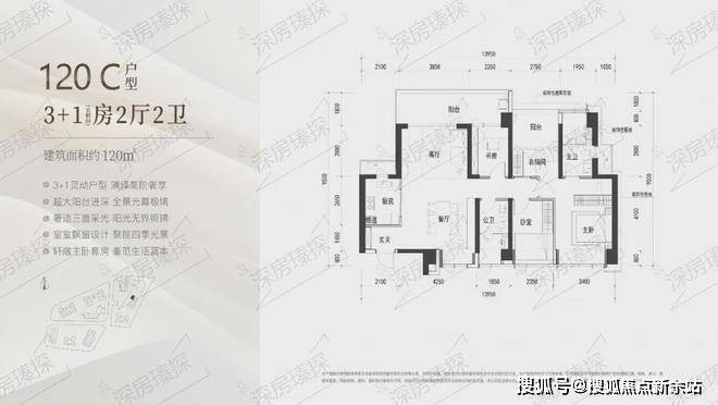 120㎡的4房2厅2卫,C户型(2栋3单元01户型),设计的是竖厅格局,客厅3.85米开间,LDKB一体化设计,动静分区,4个卧室分别做到了主卧16.65㎡/次卧9.9㎡/次卧9.16㎡/次卧6.3㎡(包含墙体飘窗),客厅连接次卧出6.1米长的宽景大阳台,U型厨房,卫生间干湿分离,得房率约90%(包含赠送),西北朝向。