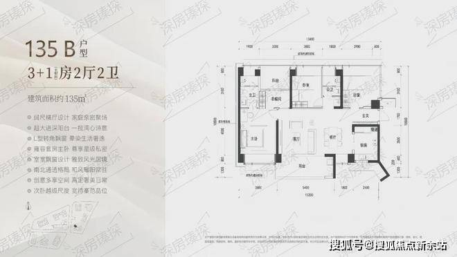 135㎡的4房2厅2卫,B户型(2栋4单元06户型),设计的是横厅南北通透格局,进门入户玄关,客餐厅7.2米开间,LDKB一体化设计,四开间朝南,4个卧室分别做到了主卧19.08㎡/次卧14.3㎡/次卧11.7㎡/次卧11.7㎡(包含墙体飘窗),客厅连接次卧出6.8米长的观景大阳台看深大校区,U型厨房,卫生间干湿分离,得房率约90%(包含赠送),阳台主朝西南向。