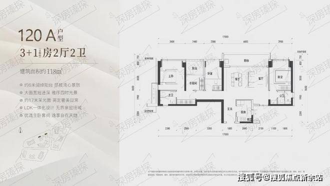 118㎡的4房2厅2卫,A户型(1栋1/2单元01户型),设计的是横厅格局,进门入户玄关,客餐厅6米开间,LDKB一体化设计,4个卧室分别做到了主卧17.65㎡/次卧11.02㎡/次卧9.12㎡/次卧8.74㎡(包含墙体飘窗),客餐厅出6米长的观景大阳台看深大校区,U型厨房,公卫三段式分离,得房率约90%(包含赠送),西北朝向。