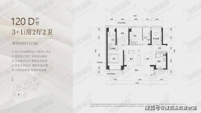 117㎡的4房2厅2卫,D户型(3栋2单元06户型),设计的是横厅南北通透格局,客餐厅6.6米开间,四开间朝南,4个卧室分别做到了主卧17.35㎡/次卧9.8㎡/次卧9.1㎡/次卧8.05㎡(包含墙体飘窗),客餐厅出6.6米长的宽景大阳台,U型厨房,公卫三段式分离,得房率约90%(包含赠送),西南朝向。