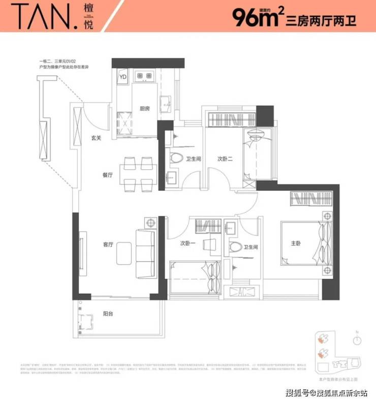 95㎡的3房2厅2卫,设计的是竖厅格局,进门入户玄关,客厅3.55米开间,LKDB一体化设计,有1个次卧做的双飘窗,U型厨房,卫生间三段式分离,得房率:74.34%(不含赠送),全部东南朝向。