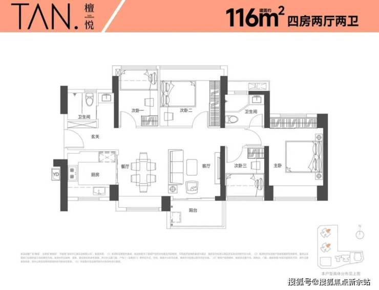 116㎡的4房2厅2卫,设计的是横厅南北通透格局,进门入户玄关,客餐厅6米开间,LKDB一体化设计,五开间朝南,超大宽面,主卧南北通设计,U型厨房,得房率:74.35%(不含赠送),阳台主朝东南向。