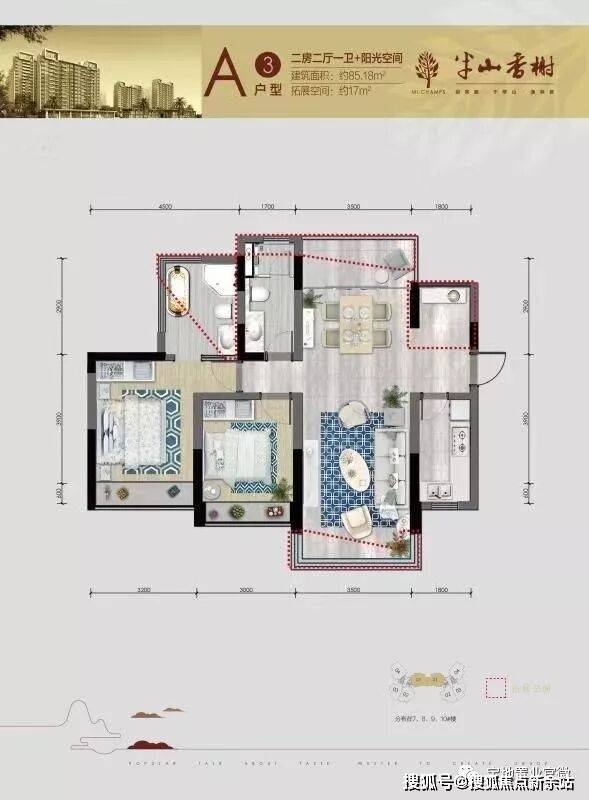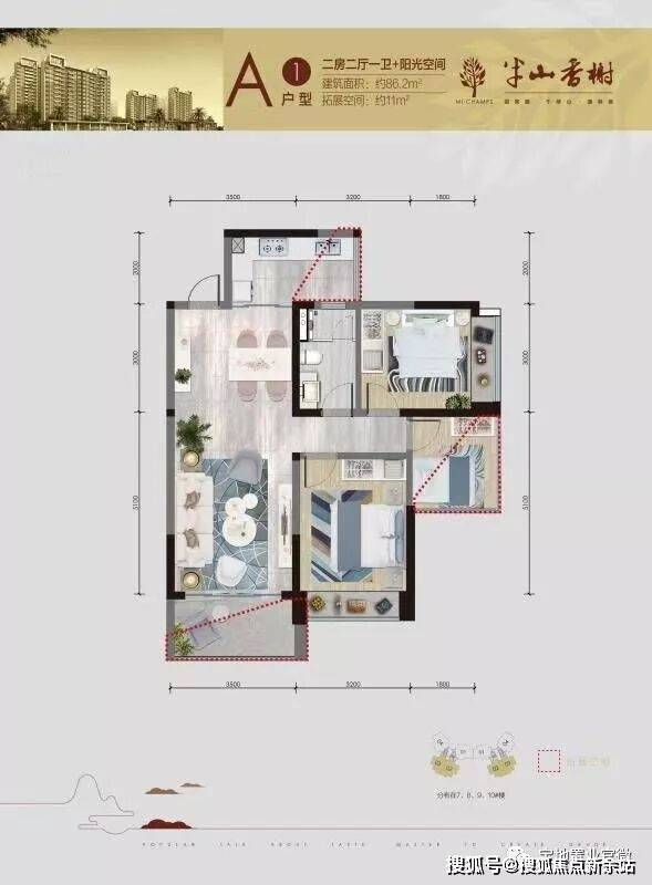 10#楼住宅:122套 层高:16层A1户型86.2㎡ 赠约11㎡ 三房二厅一卫A2户型88.09㎡ 赠约17㎡ 三房二厅一卫A3户型85.18㎡ 赠约17㎡ 二房二厅二卫