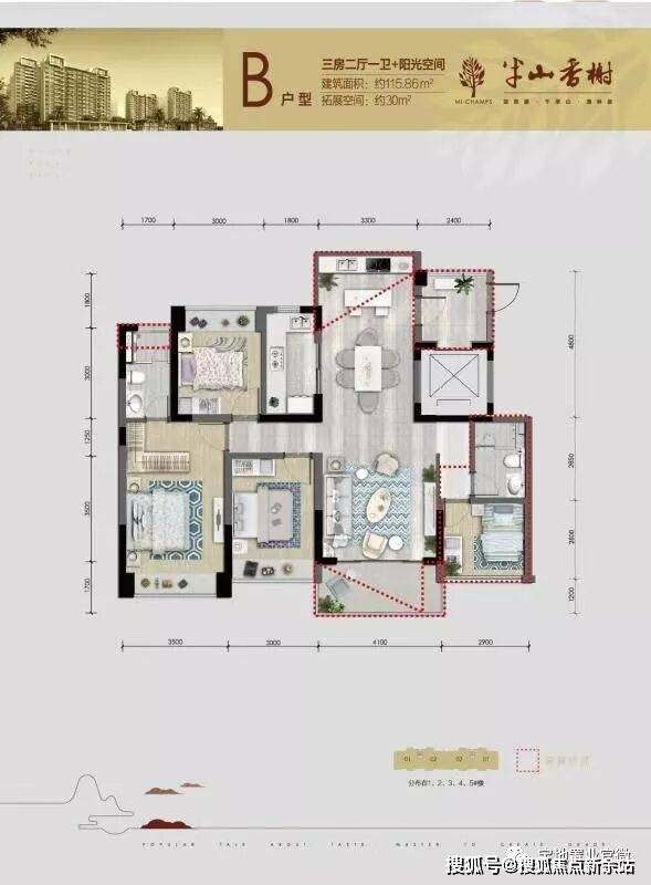 主力产品 4#、5#楼住宅:104套 层高:14层B户型115.86㎡ 赠送约30㎡ 四房二厅二厨二卫