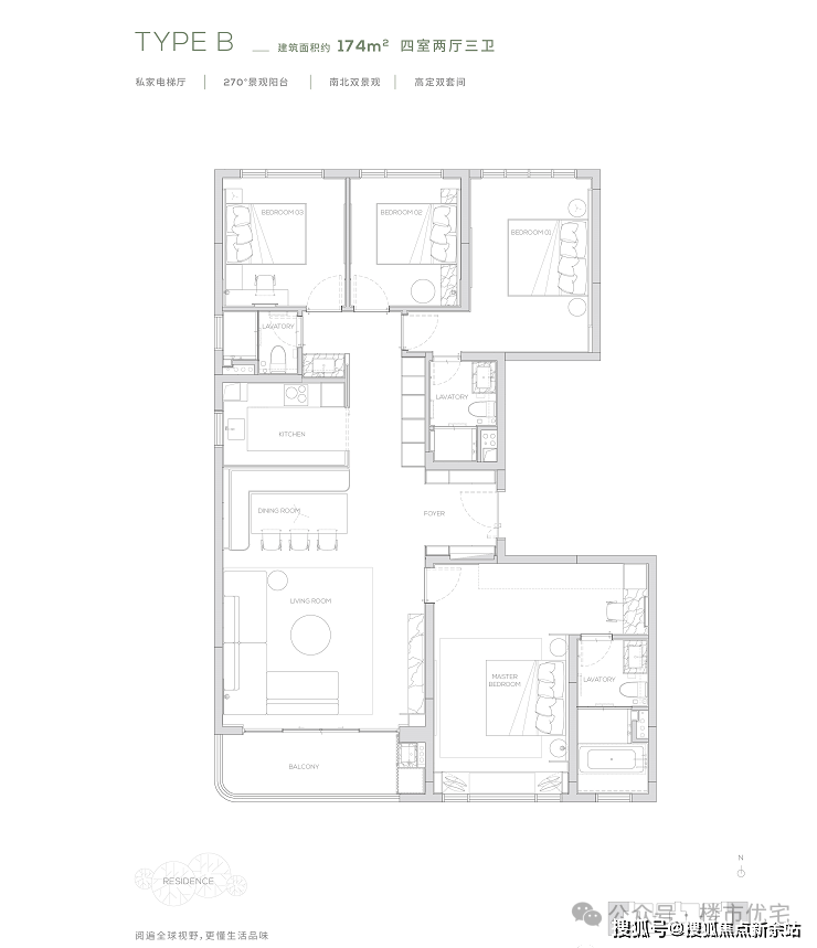 315㎡为五房两厅四卫产品,南北双阳台-独立保姆房-巨幕大宽厅-私家电梯厅