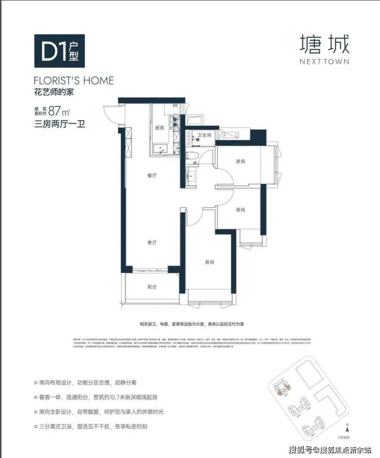“10.7 m纵深紧凑南向三房”,10.7 m纵深餐客一体,通风采光极佳