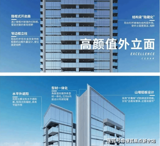 以写字楼和高级住宅美学工艺,锻造铝板幕墙+LOW-E玻璃外立面,超纤细边框设计,展现极简前沿风格。