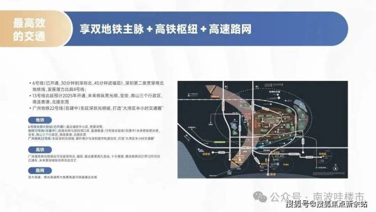 项目靠近地铁6号线【光明大街】站(已开通)直达福田,地铁13号线(在建)连接光明与深圳湾口岸。龙大高速、南光高速两大免费高速可快速通达全城。广深港高铁光明城站往返深圳北、福田便捷,赣深高铁及未来的莞深城际也在此交汇。