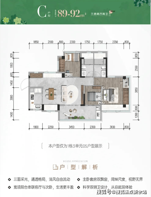 招商会展湾雍境名邸位于宝安沙井大前海会展湾片区的招商会展湾雍境名邸,本次是招商会展湾雍境二期,首推1栋3单元的195套房源,面积段有80㎡3房1卫,91㎡3房2卫,92㎡3房2卫3种户型,是3梯7户的普通高层,预计2027年9月精装交楼。