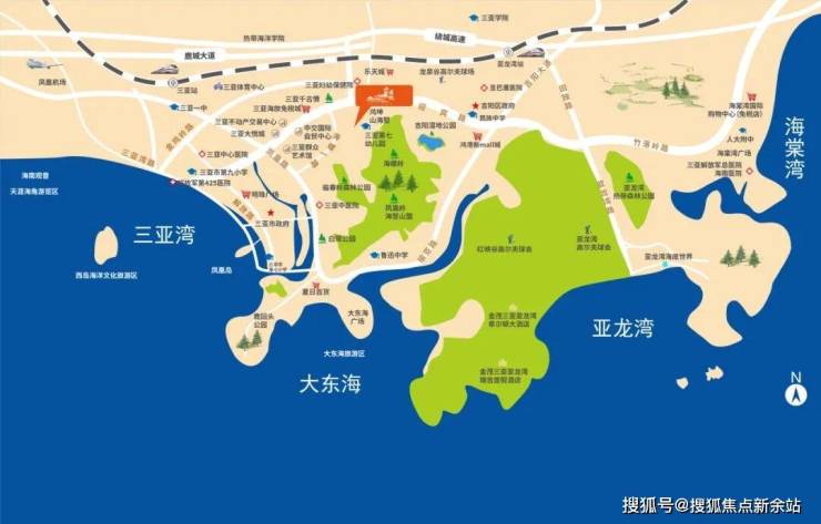 三亚体育中心、三亚市政府、吉阳区政府、三亚群众艺术馆、大东海广场、鹿回头公园、白鹭公园、凤凰岭公园、临春岭森林公园;