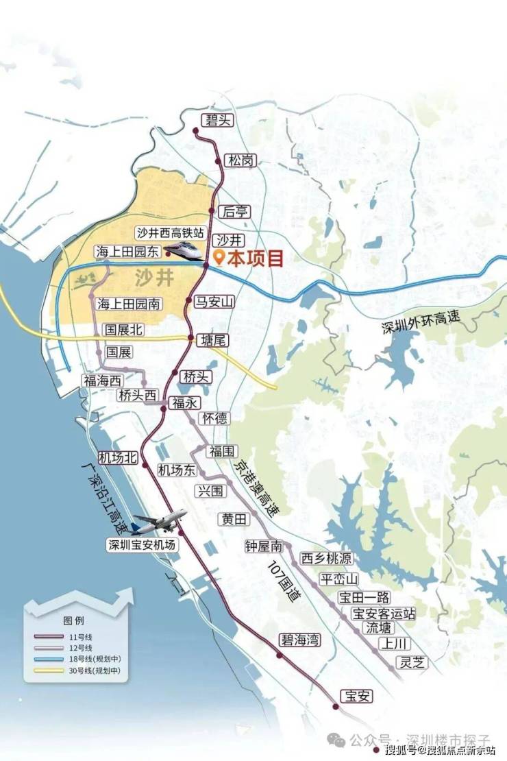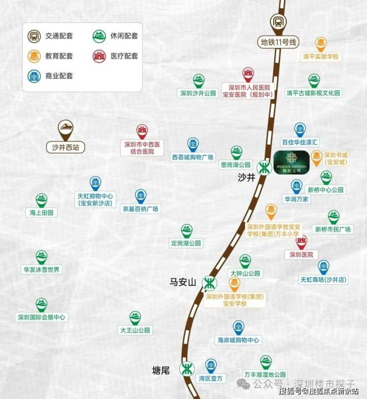 项目距离地铁11号线沙井站步行仅约460米,北侧为百佳华佳漾汇,可满足居住购物与娱乐需求,且2公里范围内有天虹商场、万丰海岸城购物中心,商业氛围较为浓厚。