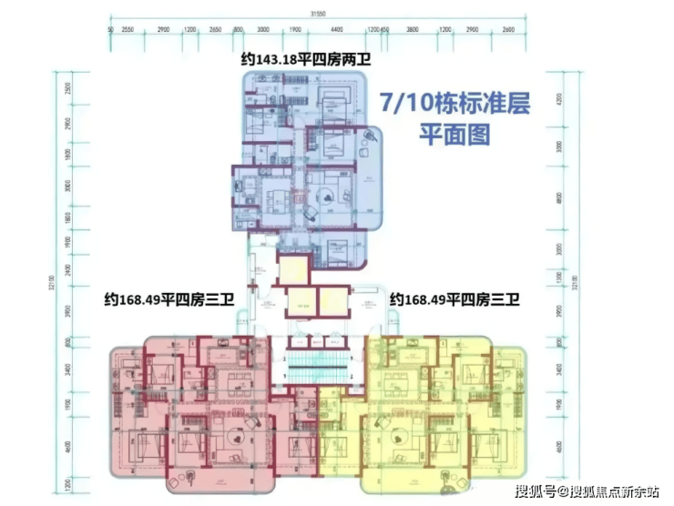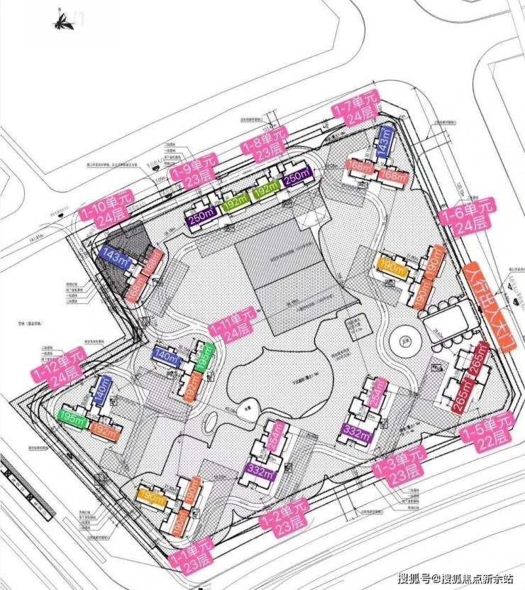 最低楼层22层,最高24层,楼层分布每楼层2-3户;地下1层,采用架空车库方式抬高地势。整体将打造约20来层的高层社区,规划容积率仅3.4,小区呈围合排布,居住密度较低。