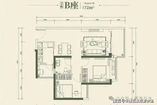 72-74平方米2房2厅1卫:适合年轻夫妇或单身贵族居住,空间布局合理,采光通风良好。