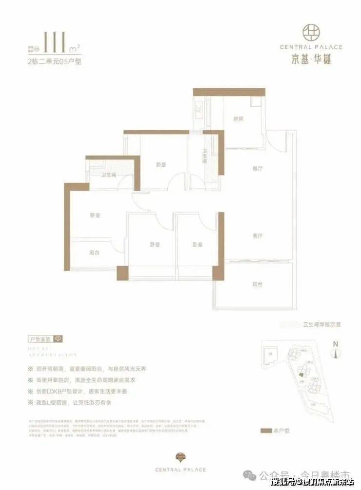 仅2栋2单元05户型才有,设计的是经典竖厅格局,LDKB一体化,动静分区,四开间朝南,U型厨房,卫生间干湿分离,得房率约73%(不含赠送),阳台西南朝向。