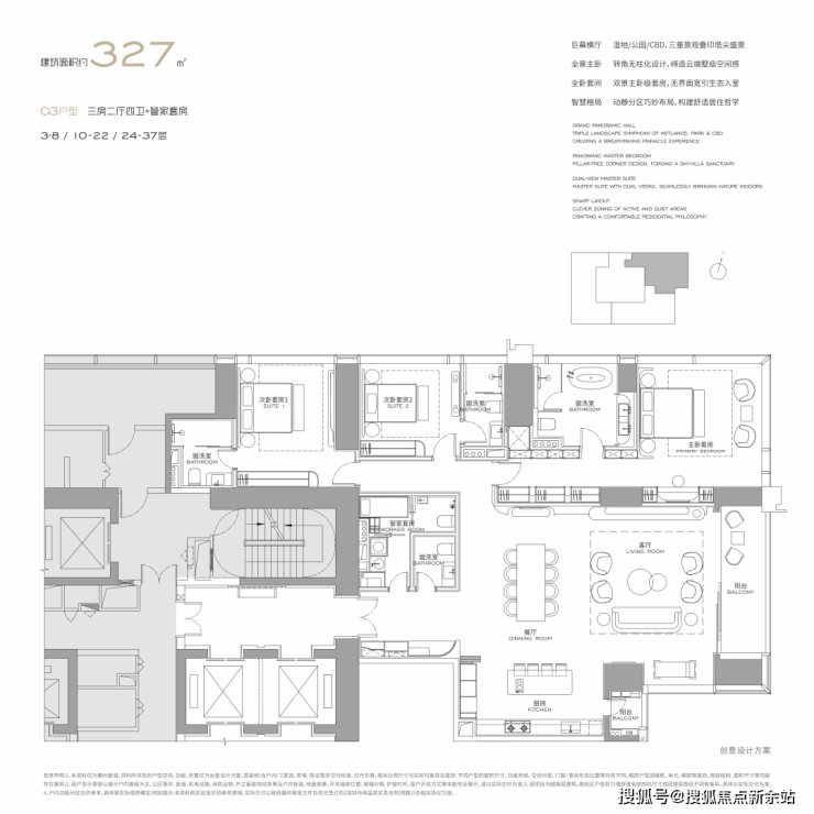 面积设计:300、400、460、570、1000平米纯粹大户型,空间方正,极致私密。