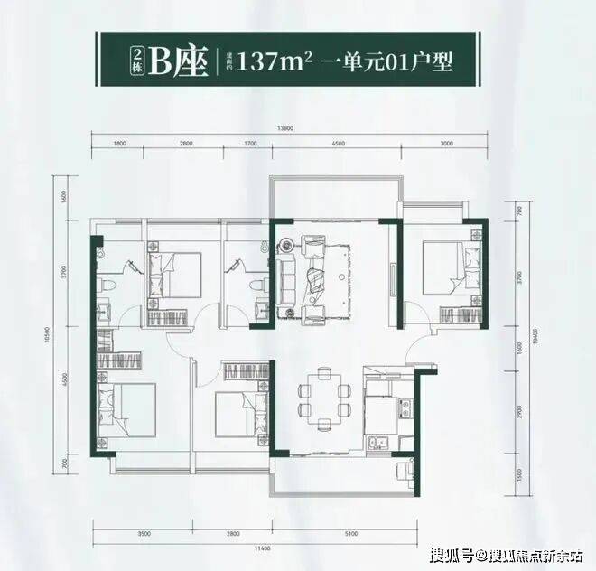 2栋B座一单元01、04户型、2栋B座二单元01户型:面积约为137-138㎡的4房2厅2卫;