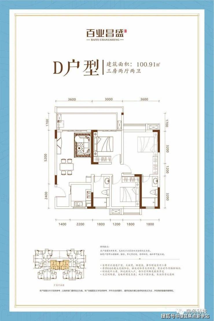 D户型 三房两厅两卫 建筑面积100.91㎡