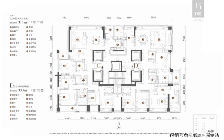 T4栋为314平和330平4房3厅3卫户型。330平户型动静分区,独立入户玄关。57平餐厨空间,奢华感十足。近60平主卧,空间阔绰,设有独立衣帽间。一次卧有景观阳台,景观视野好。314平户型将观景阳台设在主卧,主卧功能布局完备。两个户型餐、厨、客厅连成一线,动线合理。
