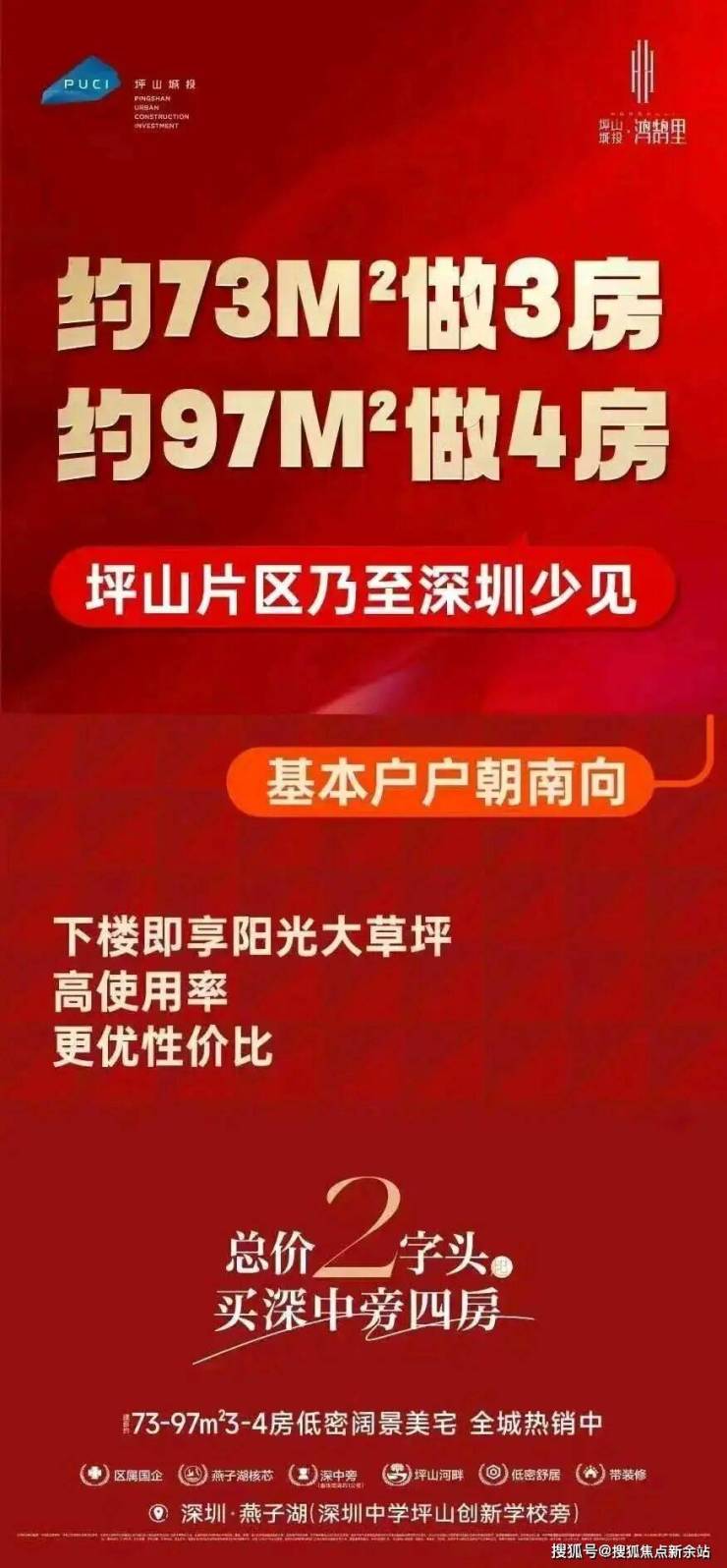 坪山城投·鸿鹄里,位于坪山区龙田街道金牛西路与春樱路交汇处,项目西侧靠近深圳市立人高级中学,东侧紧挨着坪山河湿地公园,环河而建,风景美丽,往东边走约300米是深圳市第四人民医院(深圳市萨米国际医疗中心),目前在筹备建设二期,16号地铁线“燕子湖站”、深惠城际大鹏支线“燕子湖站”距离约1.6公里。这个楼盘是由城投集团开发的,总共有5栋楼,最高32层,还有1所幼儿园。