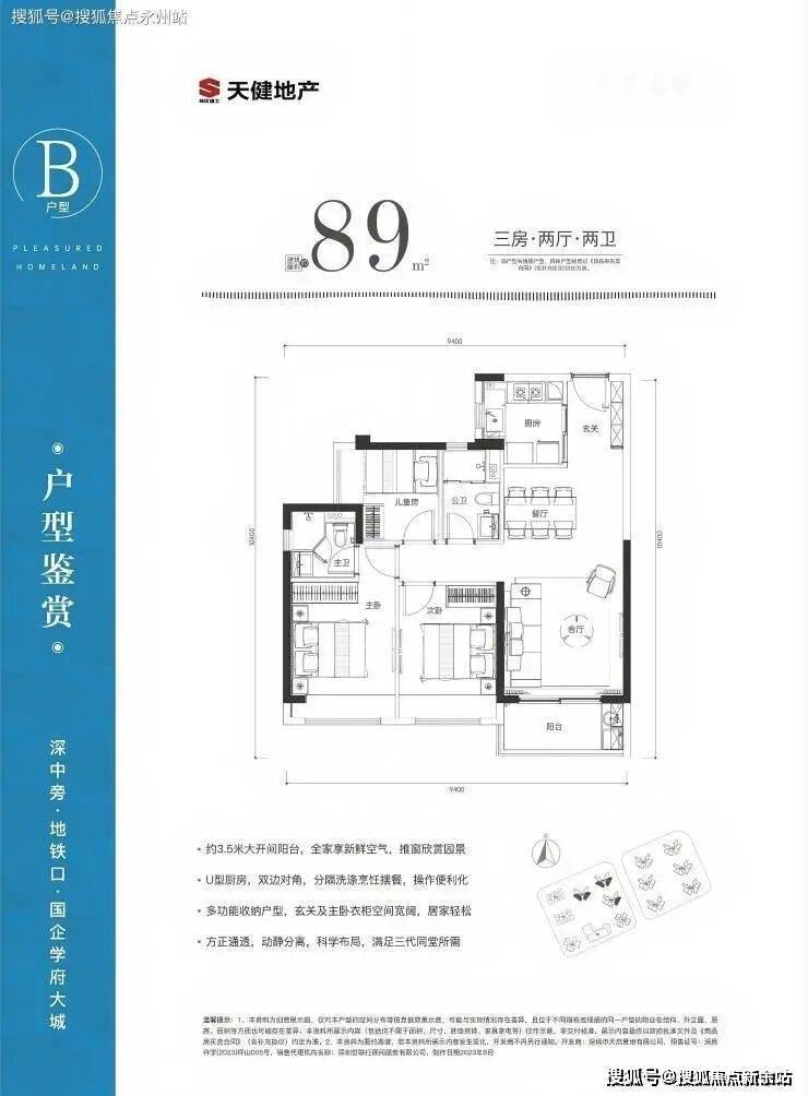 B 户型:3 室 2 厅 2 卫,约 89㎡