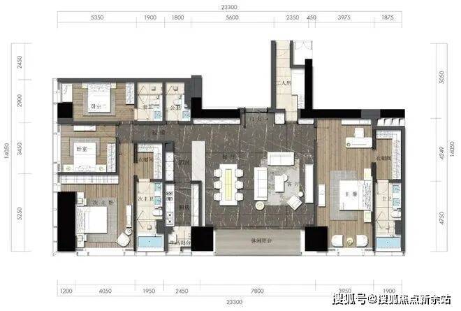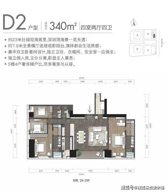 D2户型:约340㎡4房2厅4卫:B栋28-52F(高区),东朝向,户型与343㎡户型基本相同。
