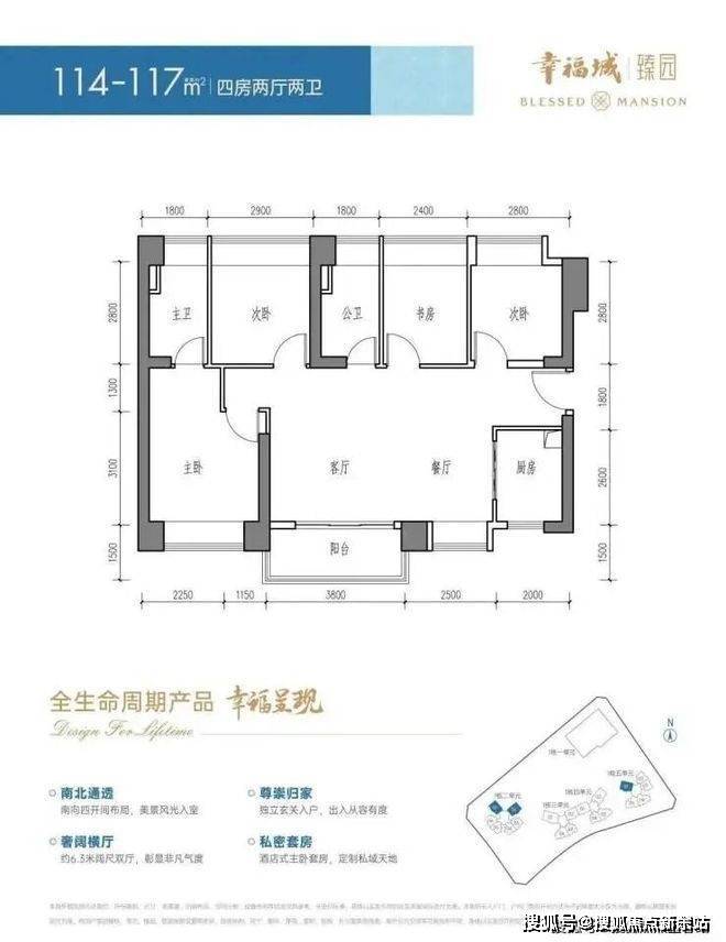 114-117㎡4房2卫,横厅南北通透格局,得房率约84.87-87.1%(包含赠送),阳台主朝西南或东南向。