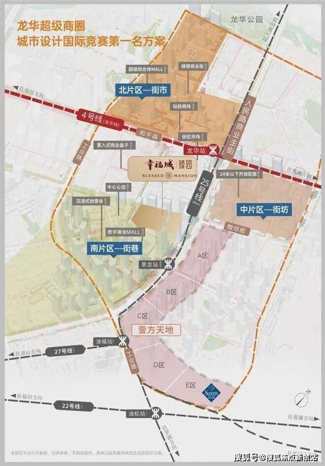 龙华商业中心城市更新单元整体除了北【幸福城臻园】外,还有中【中洲龙商】、东【灿源新】、南一【金地宸峯府】、南二【鸿荣源尚云花园】五个片区,各个片区均整体实施。