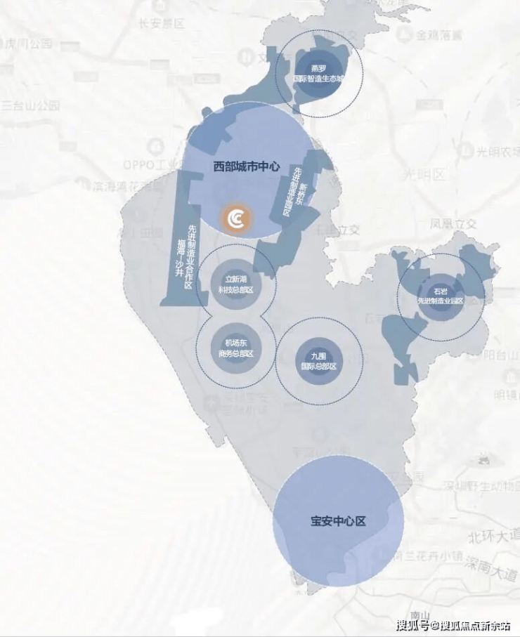 这个项目所要进行的开发建设之广度,远超南山海岸城。项目总建筑规模高达500万平米(是海岸城的10倍以上),分为三个区域建设,南侧的产业园区、中部的城市办公和商业、北部的城市生活和公园生态。业态包括了办公、酒店、住宅、MALL、名校(深外宝本部+北校区)、产业,多个公园、城市道路等等。并且,开发商还引进了深圳第五座山姆会员店,将在今年10月开业。未来将容纳数十万人口与就业,完全就是建造一座城市——南山海岸城当年没有达到这样的广度。