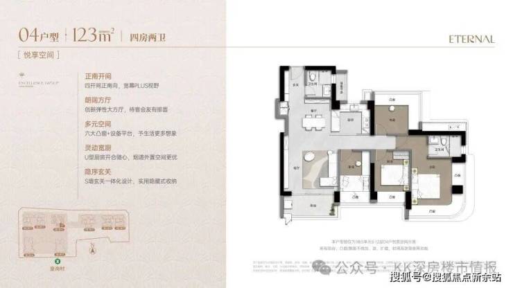 采用双龙抱珠格局,灵活适配成长型家庭。LDKB一体式布局,配备270°环幕主卧套房、U型厨房及七大飘窗,空间动静分离,实用且可变。