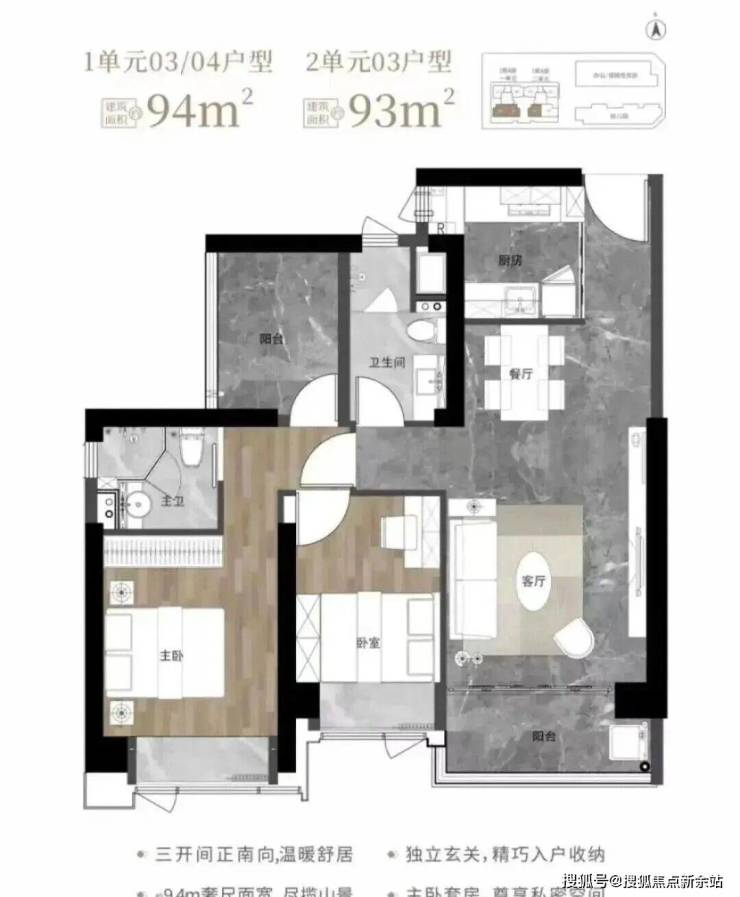 93-94㎡的3房2厅2卫,1栋1单元03、04户型/1栋2单元03户型,设计的是经典竖厅格局,客厅3.6米开间,LDKB一体化设计,动静分区,三开间朝南,9.4米面宽,二字型厨房,卫生间干湿分离,阳台正南朝向。