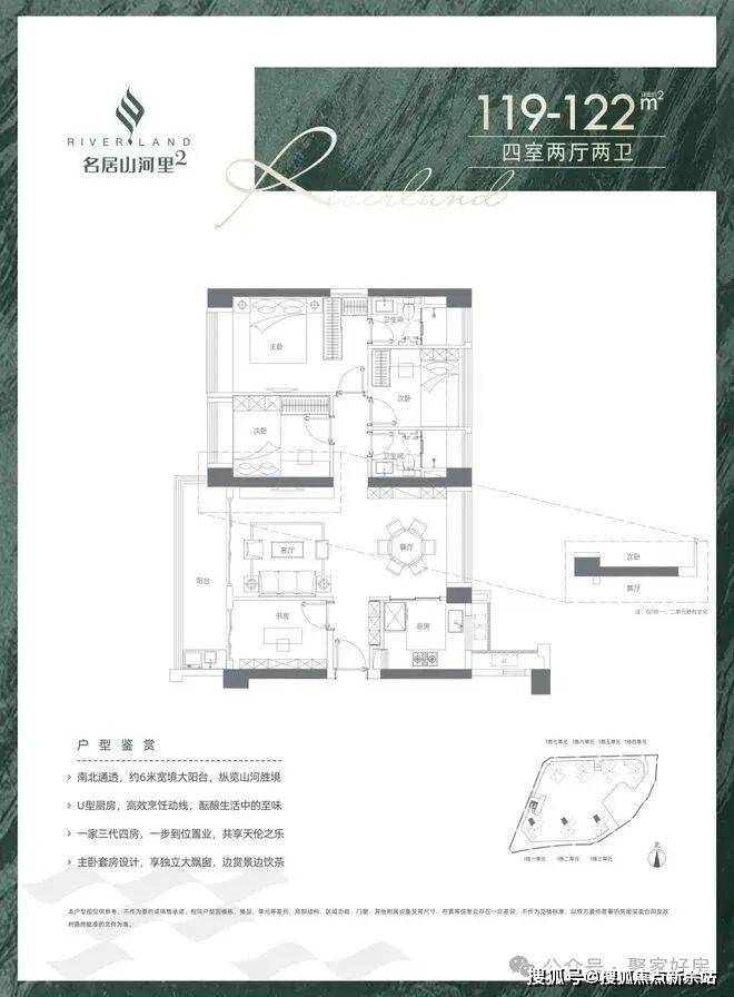 119-122㎡4房2厅2卫:设计的是竖厅南北通透格局,客厅3.8米开间,四开间朝南,全屋飘窗,U型厨房,阳台1.5米进深,6米长超大阳台,主朝西南向。