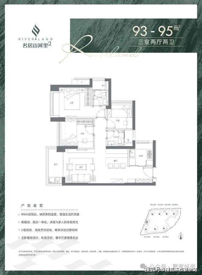 93-95㎡3房2厅2卫:设计的是经典竖厅格局,餐客厅一体化,客厅3.5米开间,三开间朝南,U型厨房,阳台1.5米进深,西南朝向。