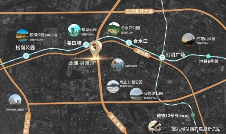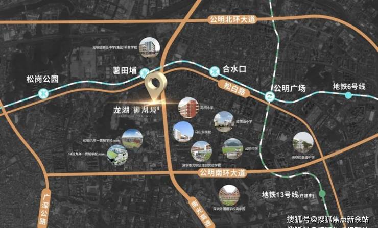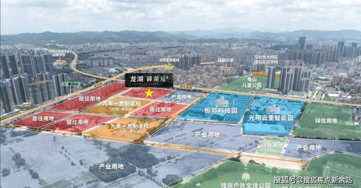 龙湖御湖境,位于光明区马田街道公明西环大道与健兴路交汇处西北侧,项目西北侧是去年入市的金地明峰府,西侧规划1所九年制60班公办学校,东南侧是署田埔龟山花园,南侧是科技园区,东侧当前是大片的城中村,6号地铁线“署田埔站”距离约300米。