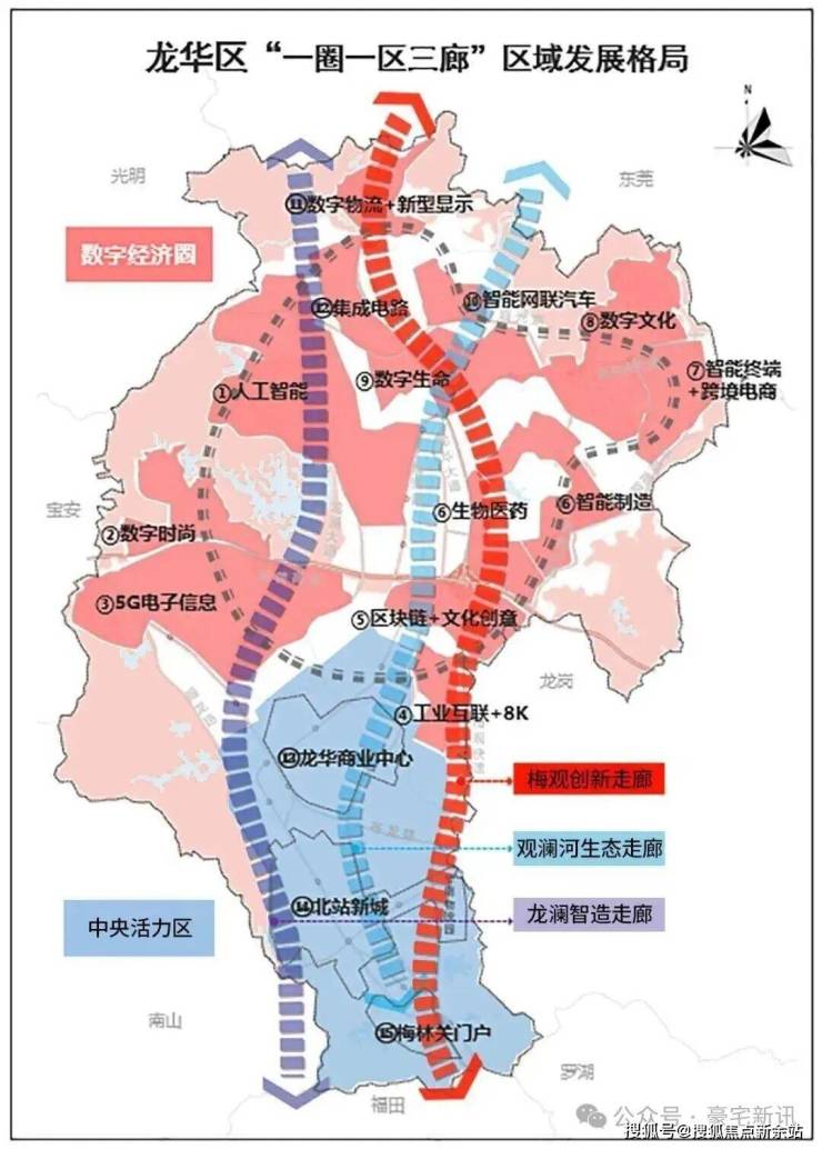 根据《龙华区城市更新和土地整备“十四五”规划》,构建“一圈一区三廊”空间格局,北部打造全球万亿级数字经济圈,南部打造深圳中央活力区,打造纵贯南北的三大都市走廊(梅观创新走廊、观澜河生态走廊、龙澜智造走廊);同时,提及提升北站国际商务区、龙华国际商圈重点片区发展能级。
