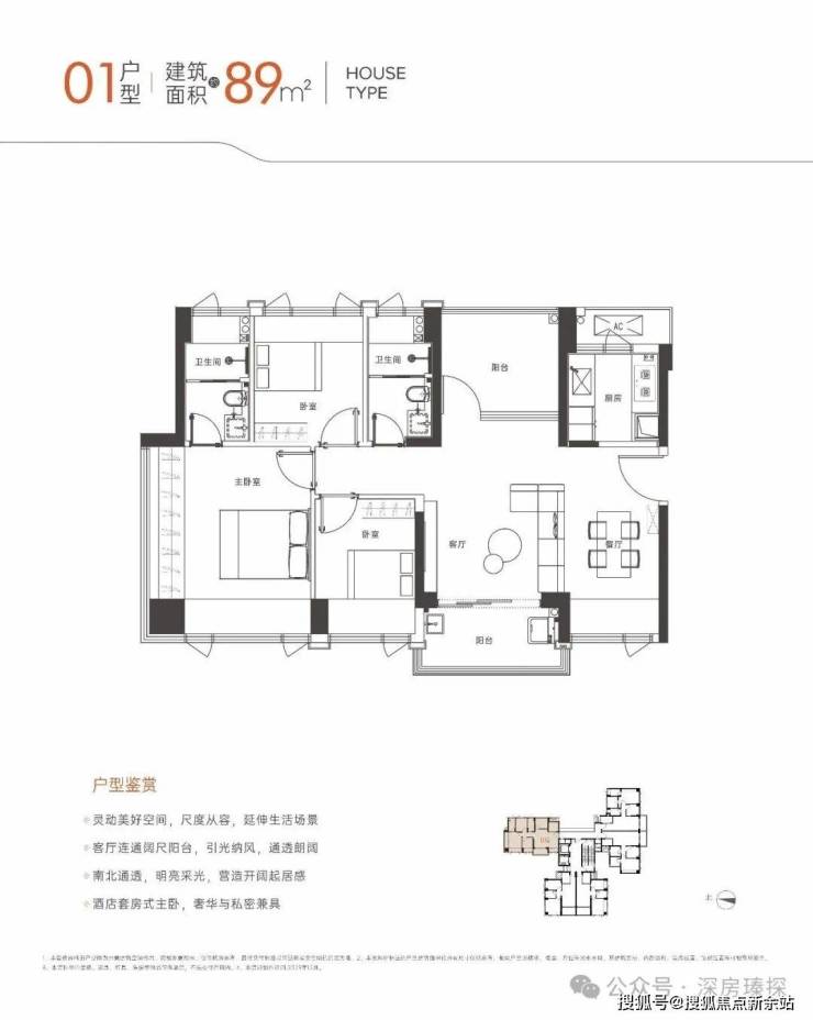 89㎡的4房2厅2卫,设计的是横厅南北通透格局,LDKB一体化,动静分区,四开间朝南,主卧双飘窗设计,U型厨房,卫生间干湿分离,得房率约98%(包含赠送),西南朝向。