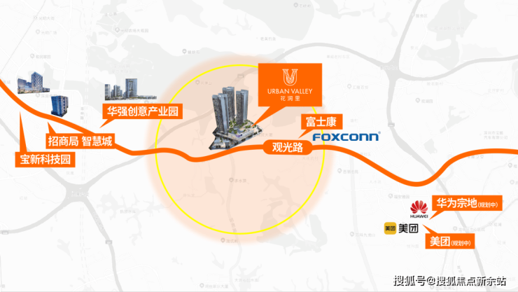 观光路沿途布局华强创意产业园、华润苹果小镇及富士康、华为、美团等具有世界级影响力企业,形成了堪称“第二深南大道”的北部产业生命走廊。