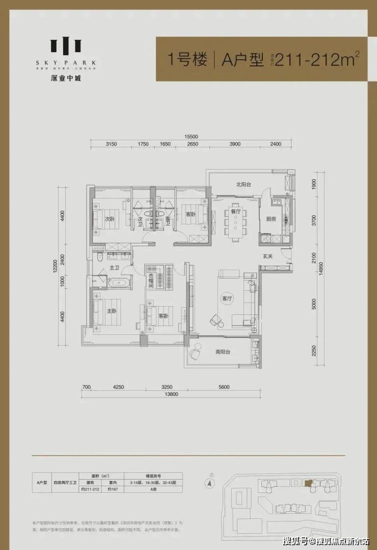 1栋:产品是面积段为137-185-192㎡的3房、212㎡的4房、以及4套300㎡以上的顶层复式单位,其中36层及以下为2梯3户“品”字形结构,37层及以上为2梯2户的板楼结构;