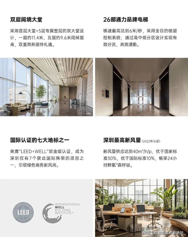 交付标准:超甲顶配交付,150mm网络架空地板、电动窗帘;模块化天花配材等,公区精装电梯:52部超高速通力电梯(办公区26部)。