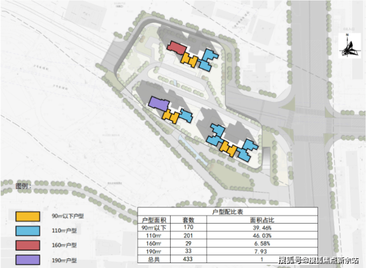 规划总户数433户,整体布局2梯4户,2梯5户,2梯6户。