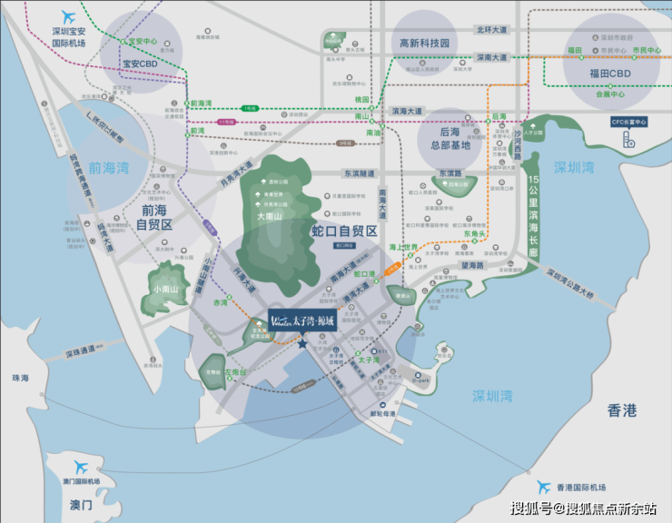 轨:区域内部规划有多条的地铁汇聚,分别是:目前正在通车的2号线的蛇口港站,赤湾站所在的5号线,以及建设中的12号线太子湾站(预计是2022年底通车),建成后将会是距离项目最近的地铁站,直线距离约200米。