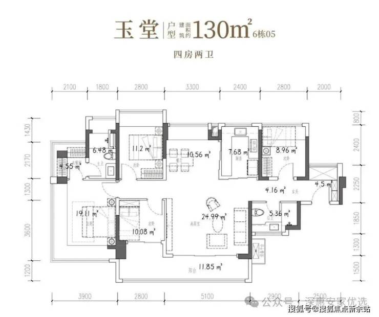 106㎡的4房2厅2卫,设计的是竖厅格局,客厅3.7米开间,LDKB一体化,S墙设计预留冰箱卡槽位,四开间朝南,动静分区,主卧270°无柱转角飘窗还带1个设备平台约1.52平,分别做到了主卧20.34㎡/次卧11.2㎡/次卧7.7㎡/次卧6.75㎡(包含墙体飘窗),U型厨房烟道外置,卫生间干湿分离,得房率约101.16%(包含赠送),客厅连接次卧出大阳台约11.76平,东南朝向。