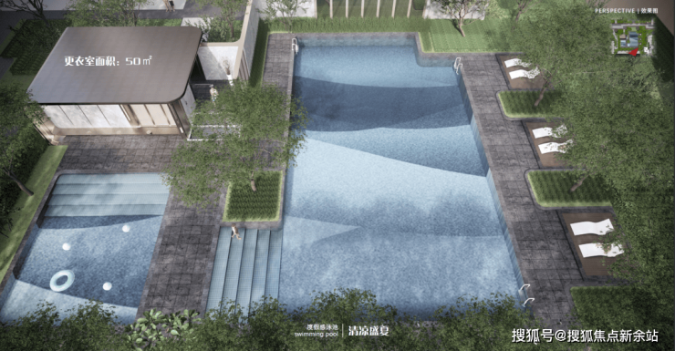 景观泳池——室外度假泳池:约360㎡成人泳池+约60㎡儿童泳池,设置独立更衣室,保障私密性同时兼顾功能性;增设休闲躺椅,提供多元社区休闲交流空间。