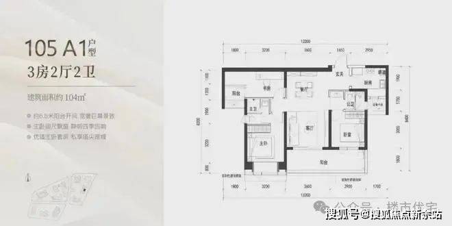 104㎡的3房2厅2卫,A1户型(2栋3单元03户型),设计的是竖厅类双龙抱珠格局,客厅3.6米开间,客餐厅一体化设计,3个卧室分别做到了主卧12.8㎡/次卧12㎡/次卧8.7㎡(包含墙体飘窗),客厅连接次卧出6.5米长的宽景大阳台,U型厨房,公卫三段式分离,得房率约90%(包含赠送),东南朝向。