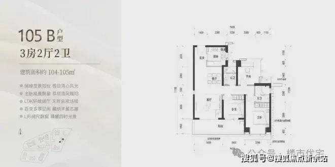 105㎡的3房2厅2卫,B户型(2栋3单元02/06户型),设计的是经典竖厅格局,客厅3.6米开间,LDKB一体化设计,三开间朝南,动静分区,3个卧室分别做到了主卧13.12㎡/次卧9.9㎡/次卧8.4㎡(包含墙体飘窗),客厅连接次卧出6.4米长的宽景大阳台,U型厨房,卫生间干湿分离,得房率约90%(包含赠送),正南或东南朝向。