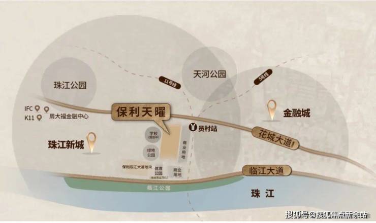 保利天曜位于天河员村绢麻厂地块,属于金融城西区核心位置,距离珠江新城直线距离不到 2 公里,开车 10 分钟能到广州塔、琶洲,妥妥的城央地段。
