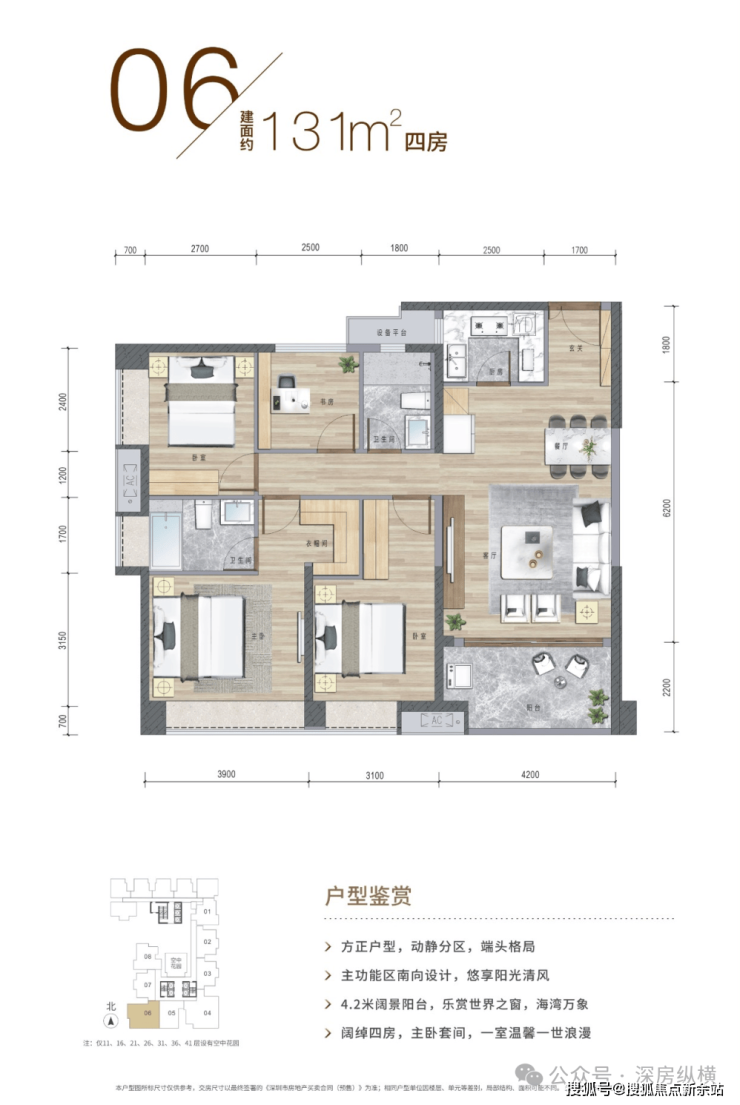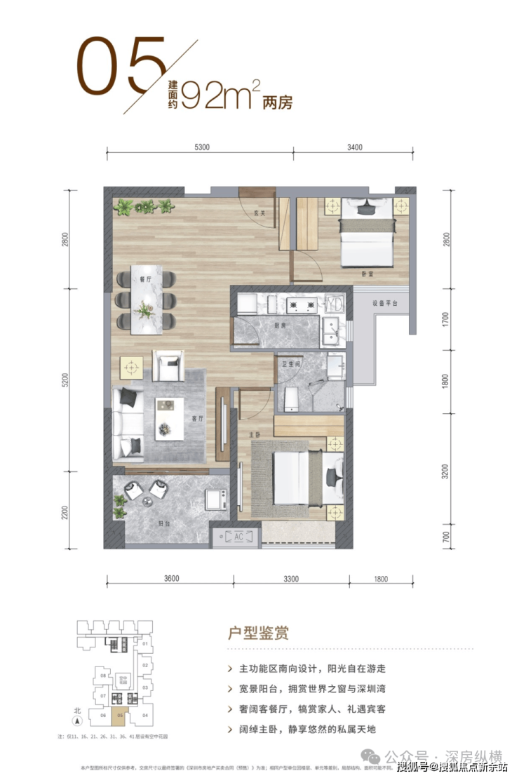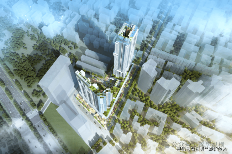 项目共有2栋楼,由南、北塔组成。其中南塔楼层较低,共有32层,包含回迁房、保障房以及商务办公;而北塔分为A、B两单元,其中A单元为住宅,共45层;B单元为公寓,共43层,1-5层为商业办公区域,6层为社区空中花园,7层往上才是住宅以及公寓。