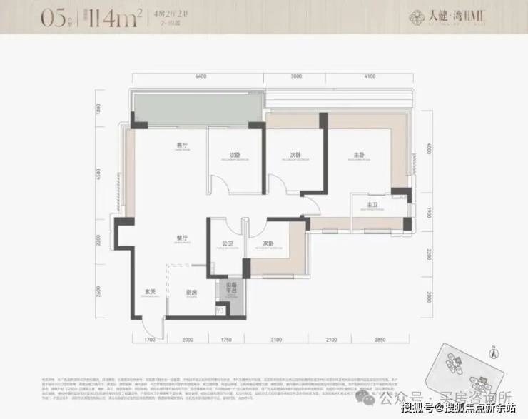 户型为113㎡四房114四房和139㎡五房约290套,2栋100米内30层住宅,2梯5户,其中主力为113㎡四房,整体以朝南及西南为主,有两套朝东北面向金众。