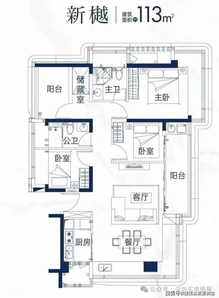113㎡的4房2厅2卫,设计的是横厅南北通透格局,进门入户玄关,客餐厅一体化设计,餐厅位双飘窗无敌视野,全屋6个飘窗面,客厅连接次卧出5.6米长的巨幕大阳台,L型厨房带1个设备平台,卫生间干湿分离也带1个设备平台,得房率约94%(包含赠送),正东朝向。