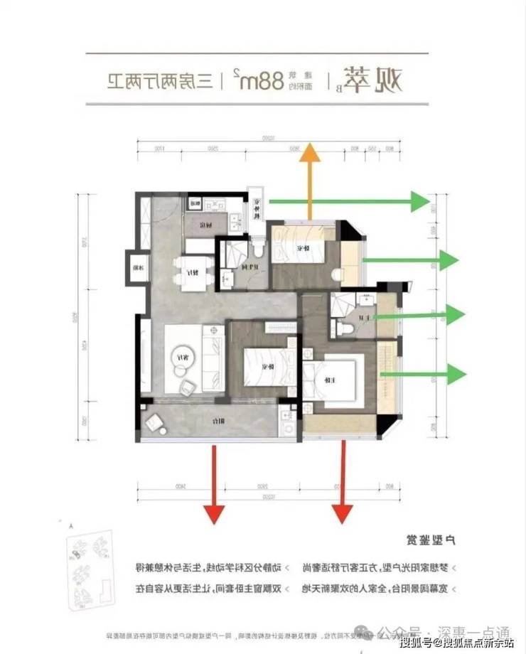 再来看一下0506的88㎡这里两个户型是一模一样,唯一区别就是绿色箭头房间朝向一个朝马路一个朝花园,0506也是2栋的户型最好东南朝向,同时景观视野还不错看学校