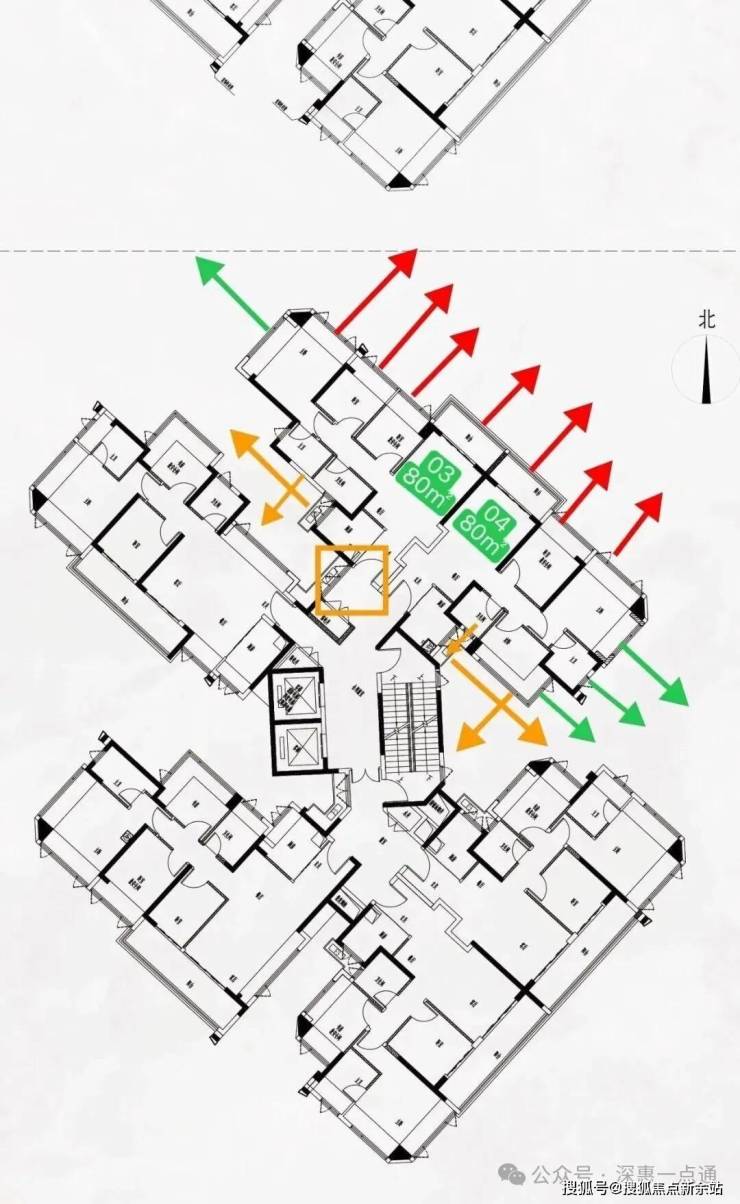 再就是绿色箭头西偏北朝向主卧飘窗以及主卧洗手间,书房的主飘窗,他看出去其实是会跟1栋的80㎡次卧对视遮挡,不过这个是小问题一个是卫生间一个是次飘窗可以通过做衣柜解决这个对视问题